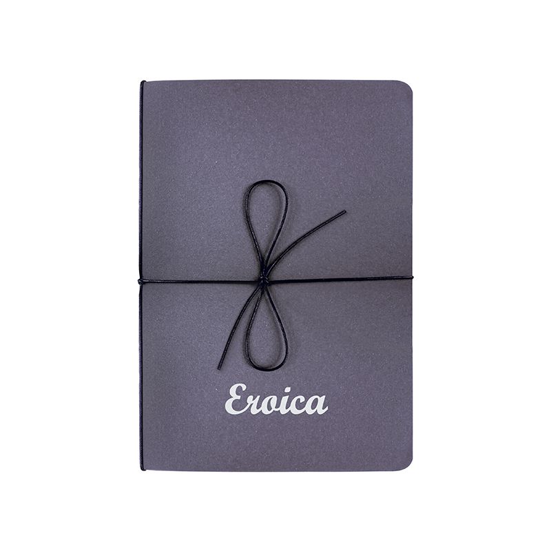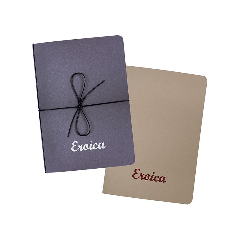 Set of two Eroica notebooks, one in dietary fiber, with cover and pages in FSC (size 14.8×21 cm), the other with waxed strap and cover in regenerated leather (size 14.8×21 cm).