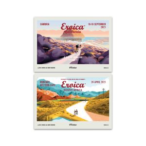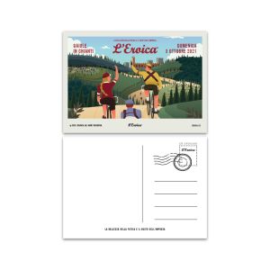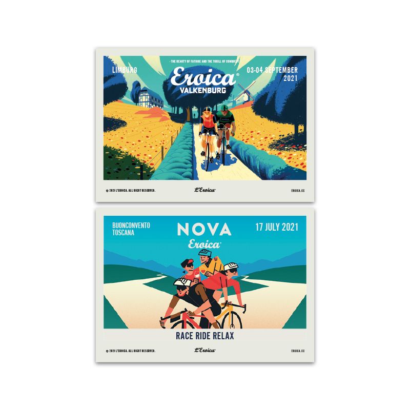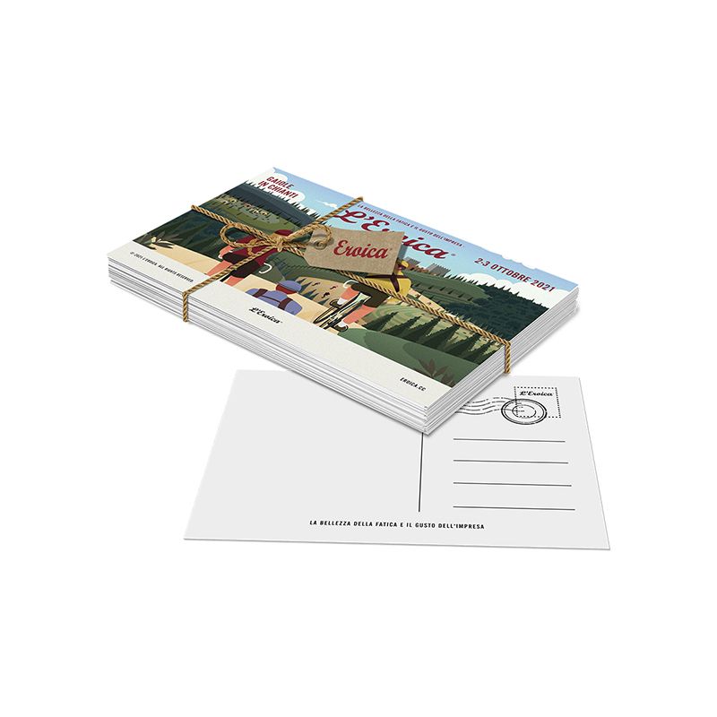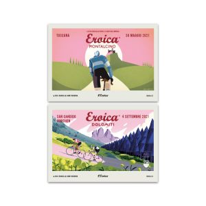Set di 7 cartoline con riproduzione delle illustrazioni degli eventi Eroica, divise per anno.