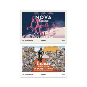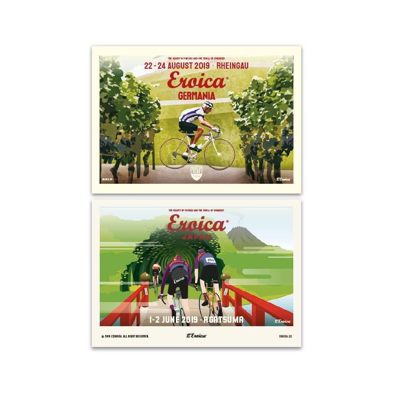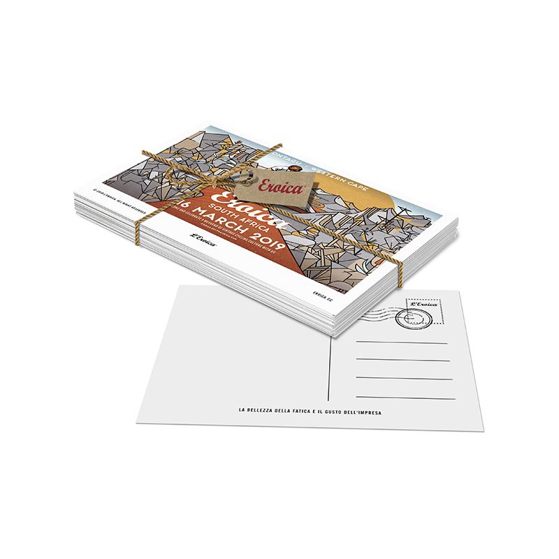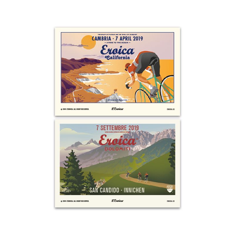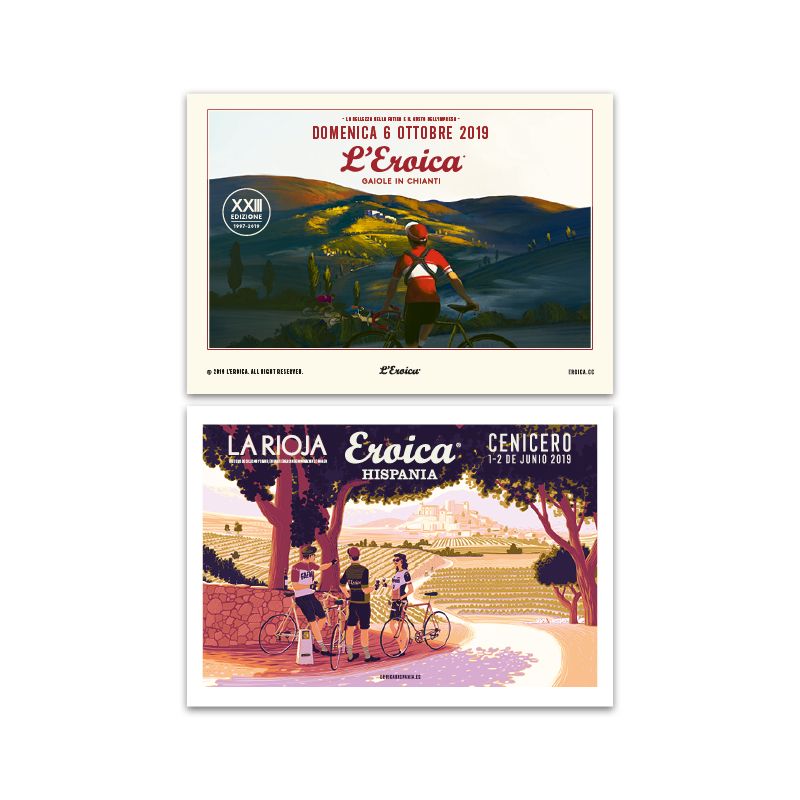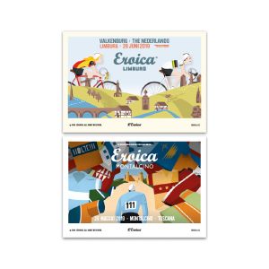 Set di 10 cartoline con riproduzione delle illustrazioni degli eventi Eroica, divise per anno.