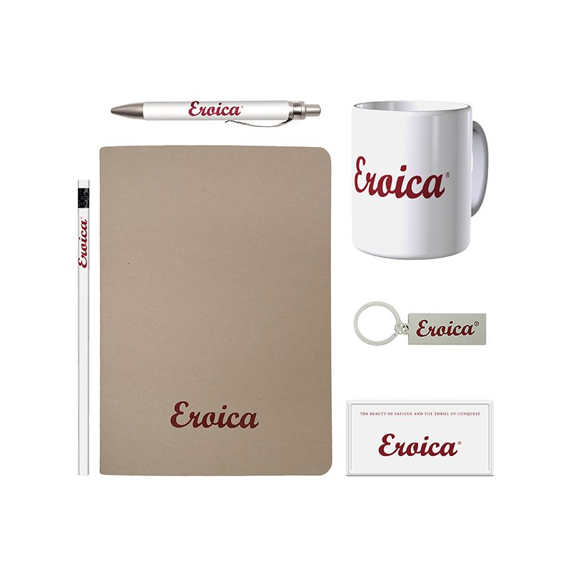 Un set composto da una mug, un quadernino con penna, una matita, un portachiavi e una calamita.