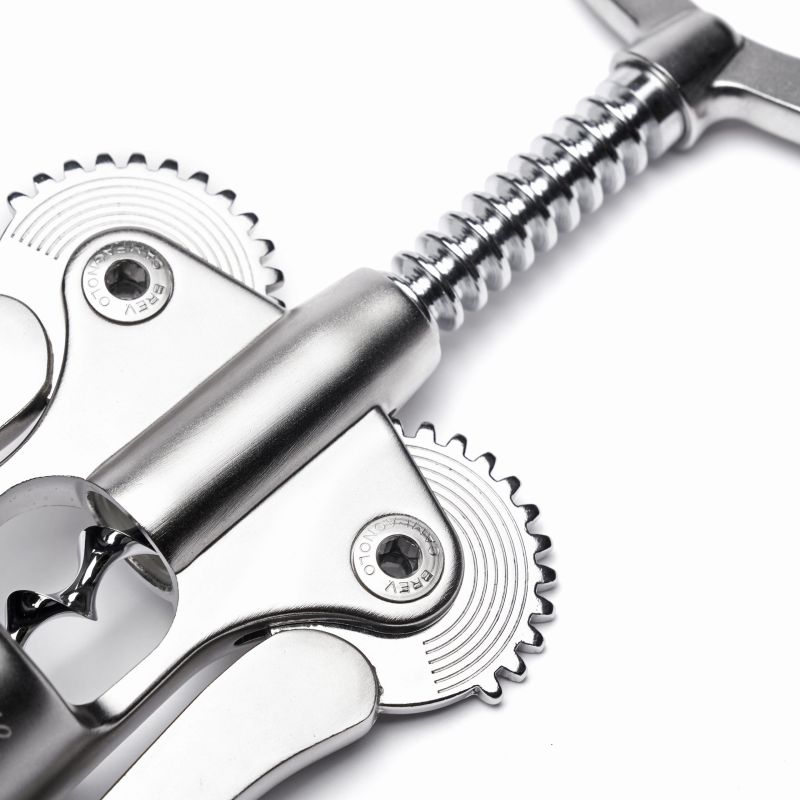 Una campana telescopica autocentrante posiziona il vermiglione esattamente nella parte centrale del tappo: una volta avvitato il vermiglione, le due leve fanno uscire il tappo con facilità e delicatezza. Si evita così di dare scossoni alla bottiglia e di sollevare i sedimenti tipici dei vini invecchiati. Inoltre, il cavatappi è concepito in modo da non forare mai la parte inferiore del tappo, evitando la caduta di pezzi di sughero nel vino.
